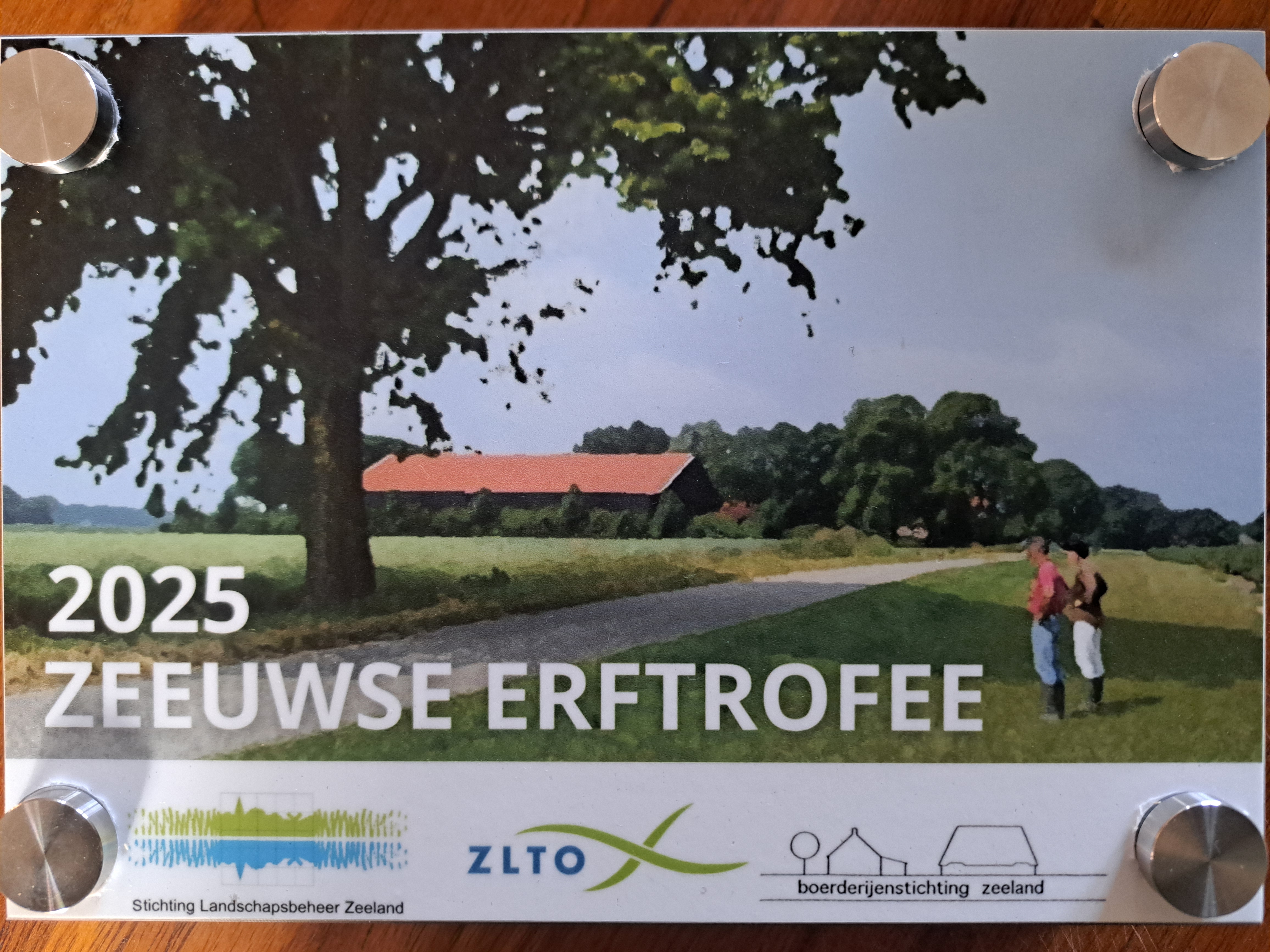 Deze Erftrofee wordt jaarlijks uitgereikt om de beurt door ZLTO, Stichting Landschapsbeheer Zeeland en De Boerderijenstichting. Dit jaar was ZLTO aan de beurt en zij hebben ons verkozen uit de genomineerde erven. Wat een eer en mooie waardering voor ons werk!